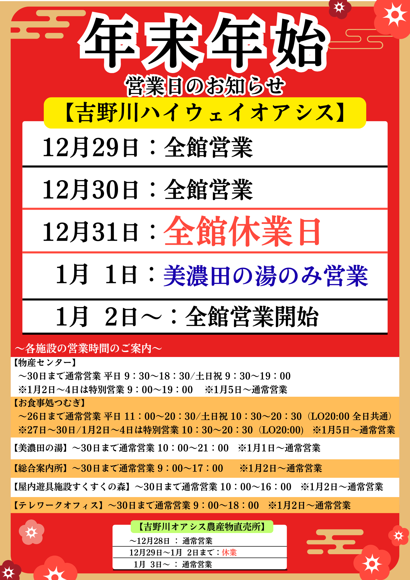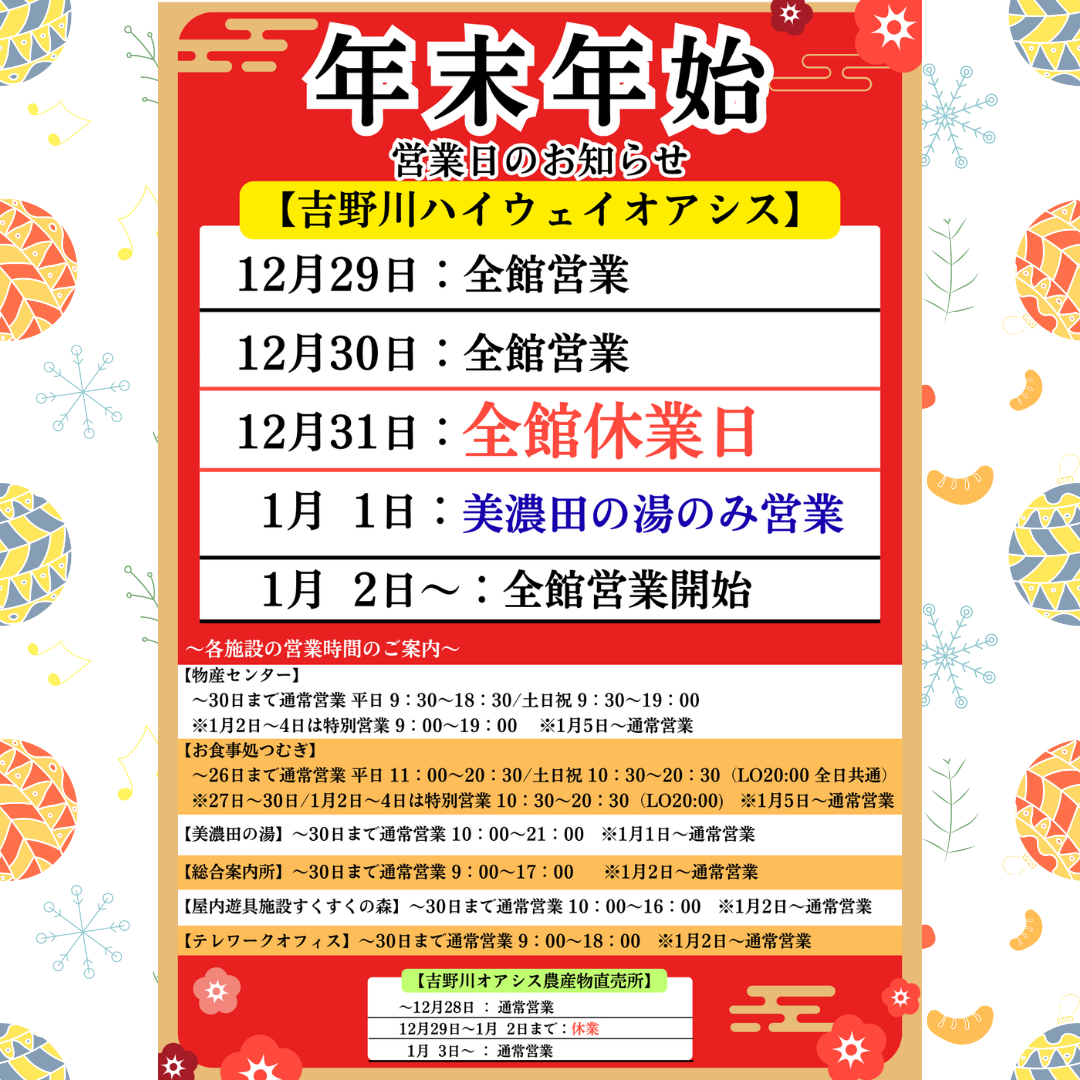 #年末年始のお知らせ #吉野川ハイウェイオアシス #東みよし町 #徳島 #温泉 #道の駅 #お正月営業
