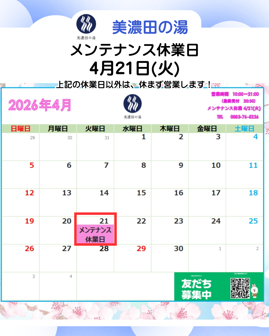 【お知らせ】2026年4月21日(火は、美濃田の湯の休業日です